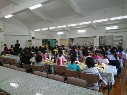 食堂に集まり、楽しい夕食が始まりました。メニューはハンバーグです。