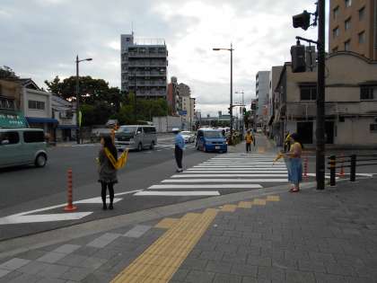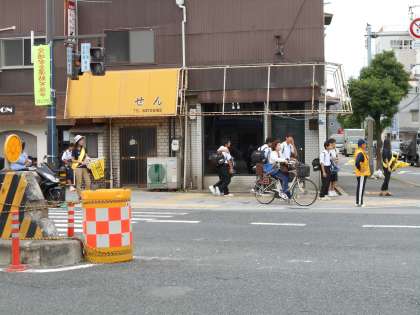 正しい交通マナーの習慣づけや交通事故防止のため、交通量の多い交差点に、地域・PTA・警察の方々に見守りをしていただきました。