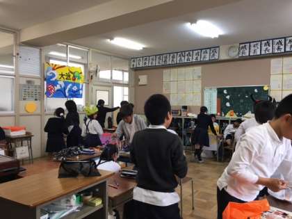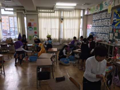 今日5年生でハロウィンパーティーをしました。それぞれ仮装をし、自分達で考えた出店を出して、1・2組を行き来し、楽しむ事ができました。