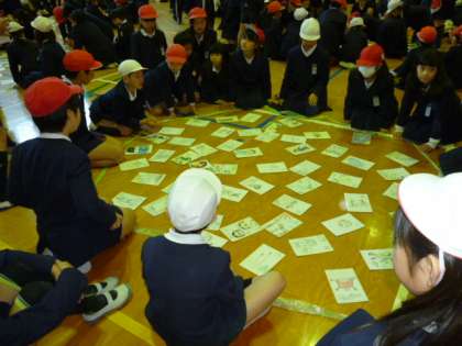カルタ大会では、たてわり班ごとに集まり、大きなカルタを取って、取った枚数を競います。代表委員会の児童が中心となって、カルタ大会を進めていきました。
