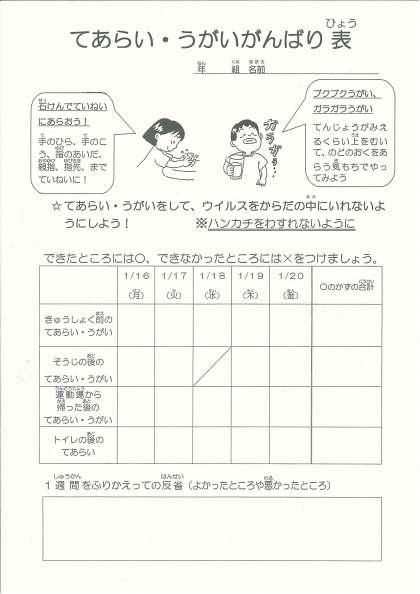 かぜやインフルエンザの予防には、てあらい・うがいが大切です。こどもたちは「てあらい・うがいがんばりカード」に○をつけて、チェックしています。ご家庭でも、てあらい・うがいの励行をご指導いただければ幸いです。