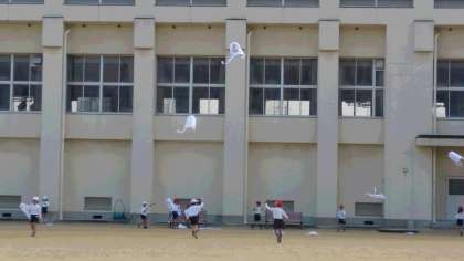 図画工作科で作った「ぐにゃぐにゃだこ」を揚げました。少し寒かったですが、晴天の中、子どもたちは自分の作った凧を嬉しそうに持って、何度も運動場を走っていました。しかし、糸を伸ばしながら空高く揚げるのは難しかったようです。何度か挑戦してコツをつかむと、少し高く揚がるようになりました。高く揚がった凧を見て、友だち同士で喜んでいました。