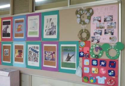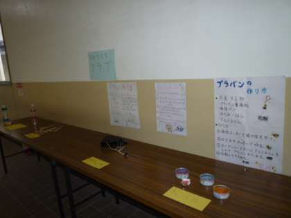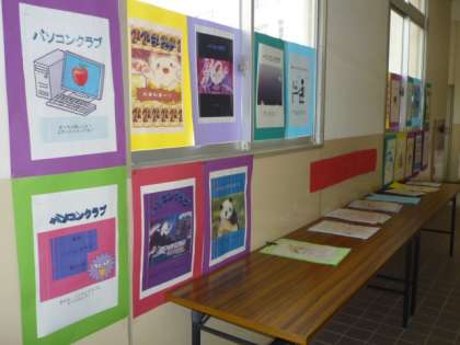 職員室前ろうかにイラスト・マンガ、手芸・料理、パソコン、ものづくりのそれぞれのクラブの作品が展示されています。子どもたちの創造性豊かな秀作、力作がならんでいます。