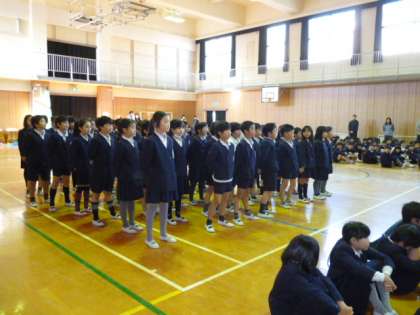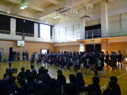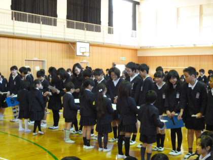 3年生の呼びかけ、5年生の合奏、1年生から色紙のプレゼント
