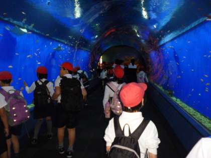 館内には、初めて見る魚や海の生き物もたくさんおり、子どもたちは熱心にメモを取りながら見学していました。「ふれあいコーナー」では、多くの子どもたちがサメやエイに触わって大興奮の様子でした。