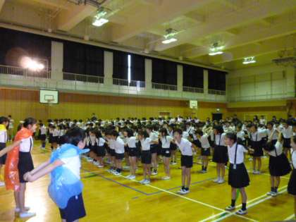 よい姿勢を意識してもらうために「せなかピーン体操」をみんなでしました。流行りの音楽に合わせて、体操をしているところです。