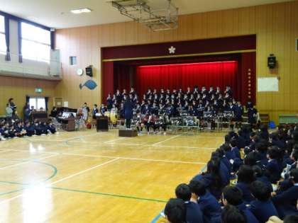 2月27日に講堂でおこないました。1年生から5年生はお祝いとお礼の気持ちを、よびかけや歌、合奏などで伝えました。また、6年生も合奏やプレゼントなどありがとうの気持ちを届けました。心と心のプレゼントをおこないました。素敵な時間を過ごすことができました。