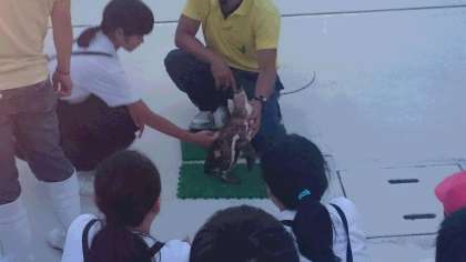 夕食の後、志摩マリンランドに行き、クラスごとにペンギンタッチと魚のえさやり体験をしました。