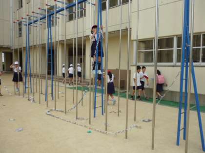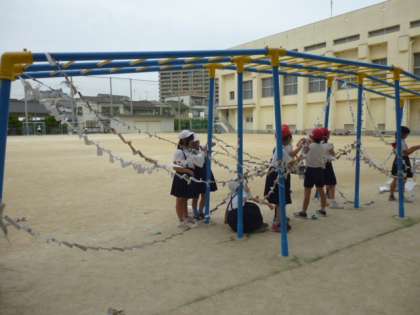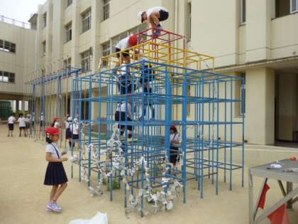 それを広い運動場に持って出て、グループで協力して飾りました。
