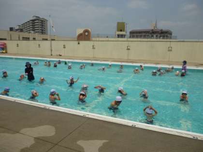 水は冷たいですが、がんばって水に入っています。電車を作って水の中を歩きました。
