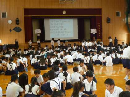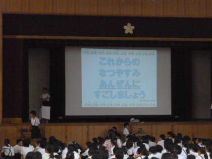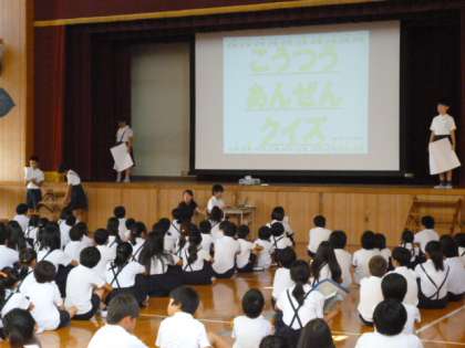 7月18日(火)、児童集会で「交通安全○×クイズ」を行いました。集会委員会の児童が、身近な交通安全についての問題を5問出しました。子どもたちは、班で協力して答えを考えていました。これからの夏休み、ルールを守って安全に気をつけて過ごしてほしいと思います。