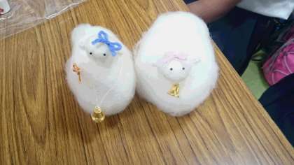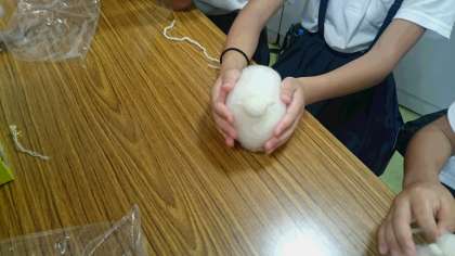 グループに分かれて本物のウールを使って、かわいい羊のマスコットを作りました。いいおみやげができました。
