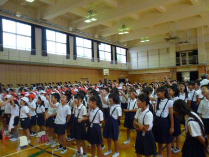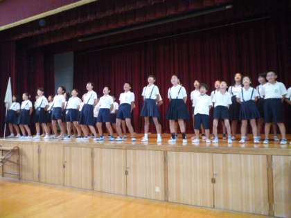 9月12日(火)の朝、雨のため、講堂で応援歌の練習をしました。舞台に応援団のメンバーがならび、「ゴーゴーゴー」を歌いました。♩ゴーゴーゴーのところで手をあげる練習も息がぴったりです。1度目は戸惑っていた子どもたちも、2度目には大きな声でタイミングよく手をあげて歌っていました。