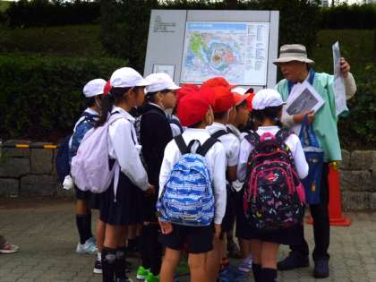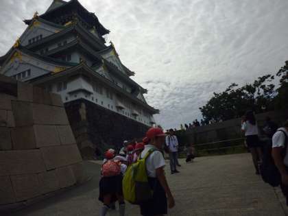 まず、各クラス2つのグループに分かれ、大阪城ボランティアガイドの方に大阪城の歴史について教えていただきながら、公園内から見学しました。その中で、第二次世界大戦の戦跡についても説明していただきました。
