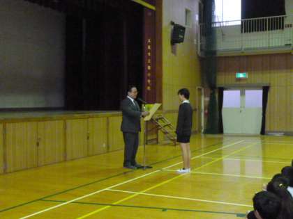11月17日の全校朝会では、校長先生のお話のあと、全国の書写硬筆コンクールで大阪府知事賞を受賞した児童の表彰を行いました。