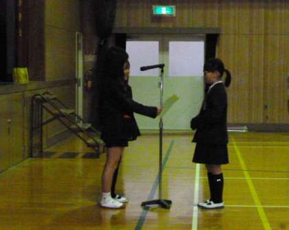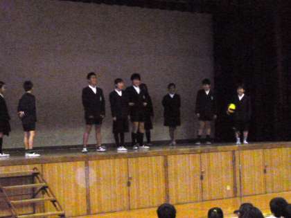 次に、代表委員会の児童が、今週の右側歩行週間について、劇で「右側を歩こう」と呼びかけました。
