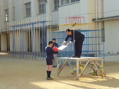 今日の全校朝会では、校長先生のお話のあと、防火防災図画コンクールの表彰と、土曜日に行われたおおさかジャンプアップ大会の表彰を行いました。