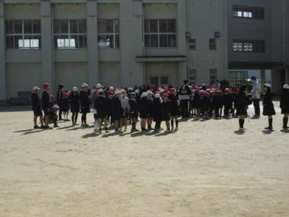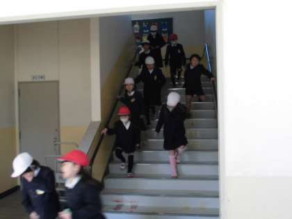 運動場で遊んでいた子どもたちも、非常ベルがなると、じっと耳を澄まして放送を聞いていました。「お(押さない)は(走らない)し(しゃべらない)も(戻らない)」を守り、素早く避難することができました。