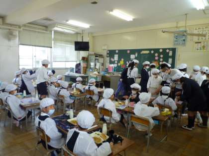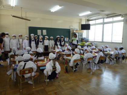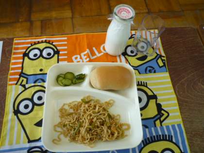 4月10日(火)、今日から給食が始まりました。1年生は小学校で初めての給食です。メニューは「焼きそばときゅうりのしょうがづけ、1/2パン、牛乳」です。6年生のお兄さんやお姉さんが、給食を運んできてくれました。「いただきます!」と元気よくあいさつをして、みんなで楽しく給食を食べました。