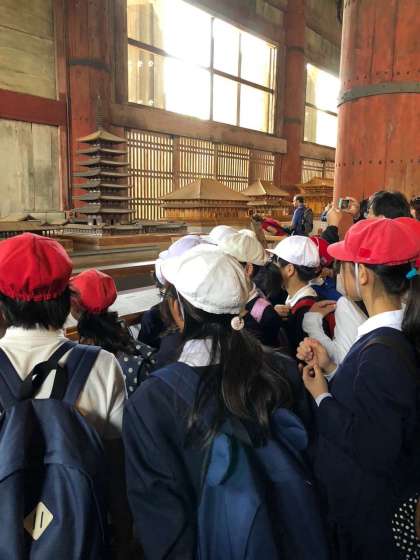 子どもたちは東大寺や大仏殿の大仏、五重の塔など昔の建築物を興味・関心を持って見学していました。