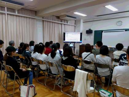 救急車が到着する(平均約9分)までの早い段階で、そばに居合わせた人が適切な応急手当てを行う事で、命が救える可能性が上がること、そして社会復帰率も上がることを聞き、参加者の先生方と保護者が真剣に学びました。
