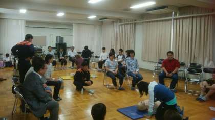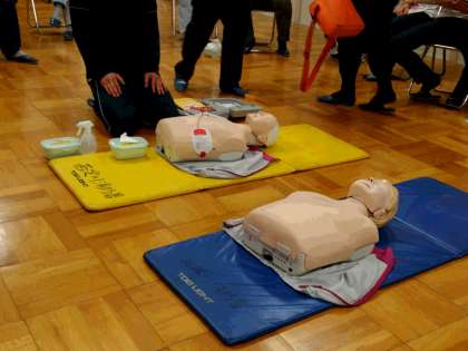 ビデオを見た後、お話上手な署員さんから人形を使った正しい胸骨圧迫の方法、人口呼吸、AEDの使い方をレクチャーしてもらい、参加者も実践しました。