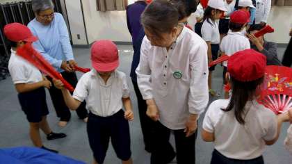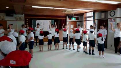 途中、老人福祉センターにも寄り、太極拳と歌体操の活動を見学させていただきました。太極拳は、扇子の開き方を体験しました。歌体操では、地域の方と一緒に手遊び歌を楽しみました。「しゃぼんだま」「かたつむり」「七夕さま」という日本の昔から伝わる歌に親しむこともできました。