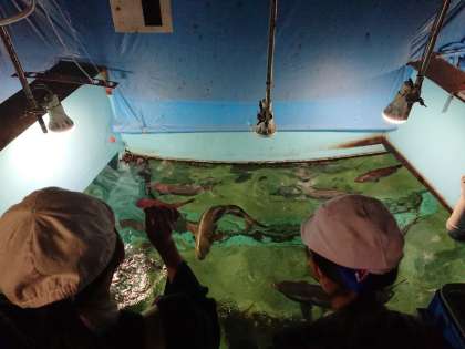 クラスごとに、ペンギンタッチと魚へ餌やりをしました。