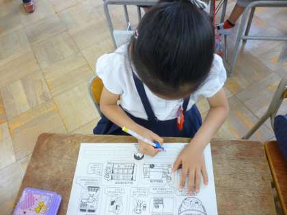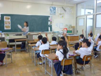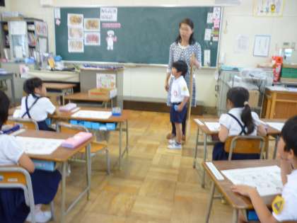 6月6日(水)、栄養教諭の方に来ていただき、栄養指導をしていただきました。給食室の調理器具の写真を見て説明してもらったり、大きなしゃもじ(実物)を持たせてもらったりしました。