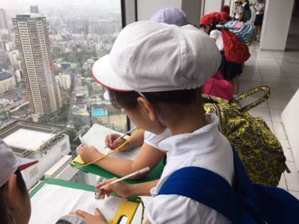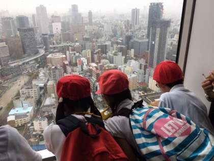 6日(水)三年生が社会見学で「梅田スカイビル」へ行きました。子どもたちは梅田スカイビルの屋上に上がり、東西南北ごとに大阪市のようすを眺めました。とても高いスカイビルの屋上から、大阪市のようすを見て、学習することができ、子どもたちも嬉しそうでした。