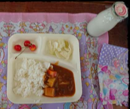 メニューはハヤシライス、キャベツのゆずドレッシング、さくらんぼ、ごはん、牛乳で、おいしくいただきました。給食調理員さんに感謝の心を込めて「ごちそうさまでした。おいしかったです。」。