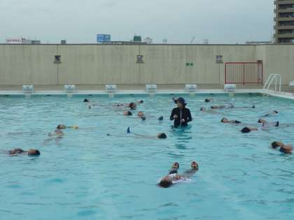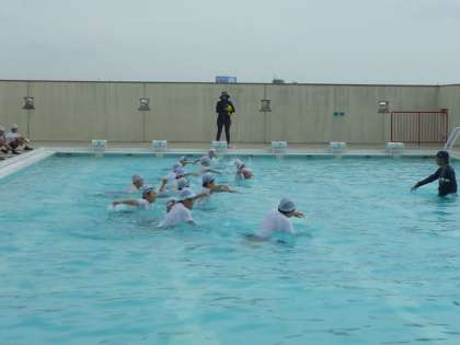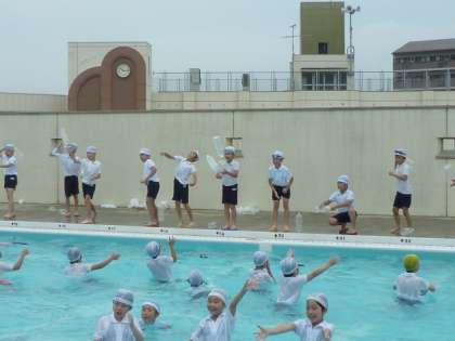 6月28日(木)4、5、6年生の着衣泳を行いました。子どもたちは服を着てプールに入り、歩きにくさや泳ぎにくさを知りました。また、実際に落ちてしまった時に、あわてずに水に浮いて、体力を消耗しないことの大切さを学びました。さらに、ペットボトルを使って救助の仕方も学びました。