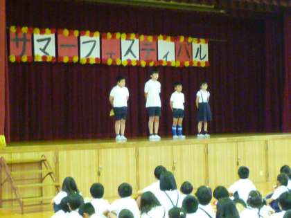 7月7日に土曜授業で夏の集会(佃サマーフェスティバル)を行いました。はじめに講堂で代表委員の人たちから説明がありました。
