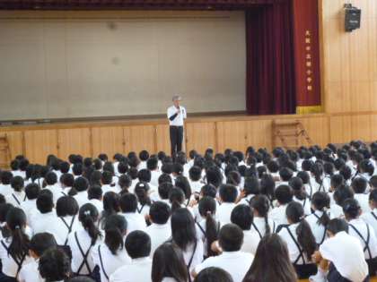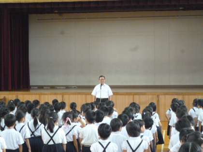 次に生活指導の先生から、最近とても暑い日が続いているので、外出するときは帽子をかぶり、タオルや水筒などをもって行くようになど、夏休みを安全に過ごすためのお話がありました。
