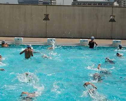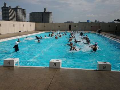 夏休みに入って7月31日までプール開放を行っています。高・中・低学年の順で、楽しみながら水に慣れ、泳力の向上につなげています。