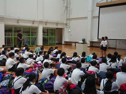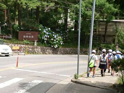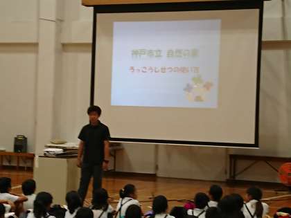 六甲山牧場から歩いて神戸市立自然の家に着きました。入所式をして、自然の家の方からオリエンテーションがあり、施設の使い方や注意することなど、ていねいに説明がありました。