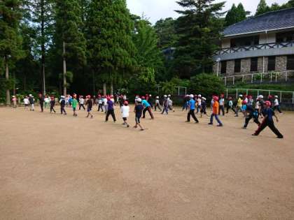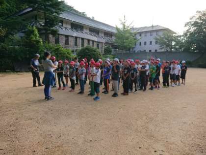 みんな元気に集って、朝の会を行いました。昨夜の雨で、運動場は湿っていますが、支障はありません。