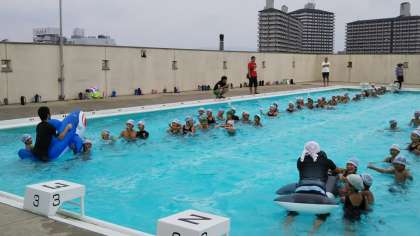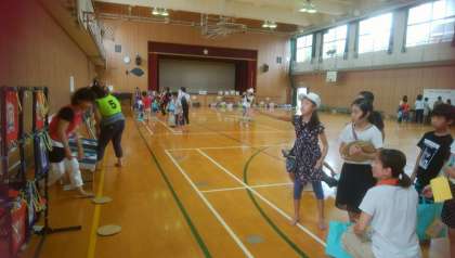 講堂での紙飛行機作り、的あて等は高学年も楽しみました。プールでのゲームは低学年、高学年共に歓声が響き、あっという間に1時間経ちました。