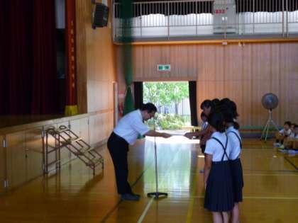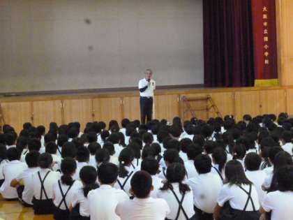 始業式では、「学習や行事を通して、一人ひとりが力を伸ばし、みんなで力を合わせてやり遂げる中、お互いの頑張りに気づき、認め合う2学期にしていきましょう」と校長先生からお話があり、その後、「大阪市小学校スポーツ交流大会」で優勝した、ソフトボール女子のみなさんに賞状を渡しました。それから生活指導の先生のお話のあと、元気よく校歌を歌いました。