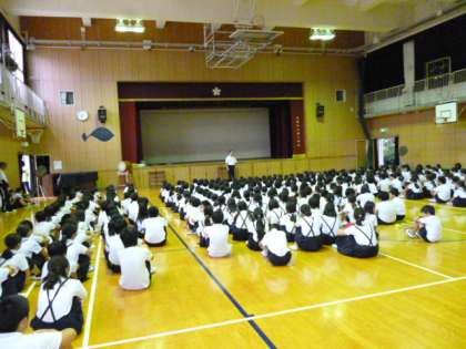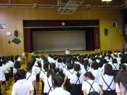 9月10日(月)、臨時の全校朝会を行いました。先週は、台風とその後の停電の影響で、4日間の学校休業となりました。その間の学校の様子について、校長先生からお話がありました。