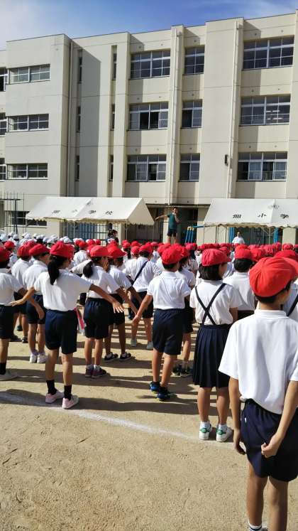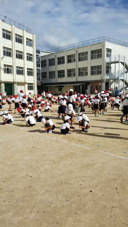 9月11日、整列の練習をしました。そのあと、運動場の石やごみを拾いました。