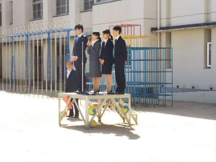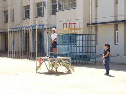 次に、担当の先生が、今月の生活目標「外で元気に遊ぼう」について話しました。最後に、運動委員会委員長より、今日から一輪車で遊べることについてお知らせがありました。