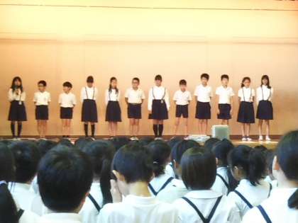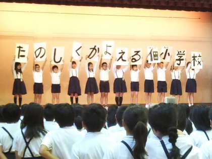 それぞれの児童が決意表明をしたあと、後期の目標「たのしくかよえる佃小学校」を発表しました。