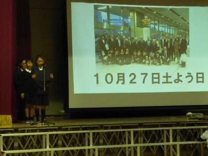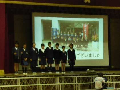 11月6日(火)、全校朝会で、先月27日に東京で行われた、第54回佃島交歓会の報告会を行いました。参加した代表児童8名が発表しました。