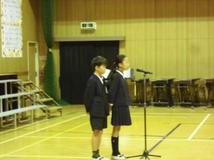 児童のあいさつ、校長先生のあいさつのあと、3年生、1年生、5年生、2年生、4年生、6年生の順に発表しました。