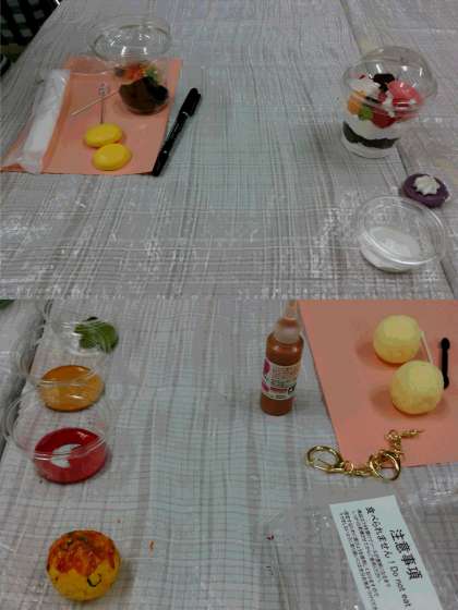 パフェサンプル制作グループは、まずフルーツやマカロンなどトッピングを制作してから、生クリームに見えるシリコンを絞り出していました。パティシエになった気分で楽しく丁寧に作っていました。