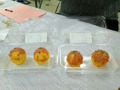 たこ焼きサンプル制作のグループはスタッフさんが手作りした塩化ビニールたこ焼きに着色したり、トッピングをのせると、ソースの香りが漂いそうなたこ焼きが完成しました。