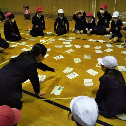 なかよし班の赤色対青色、黄色対緑色で取れたカルタの枚数を競いました。