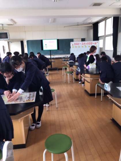 1月25日 カルビースナックスクールがありました。カルビーからゲストティーチャーをお迎えして、おやつの適切な食べ方、量について学びました。おやつを食べるのに適切な時間はご飯の2時間前、量は35g、カロリーは200kcalです。おやつを食べる時は思い出して下さいね。