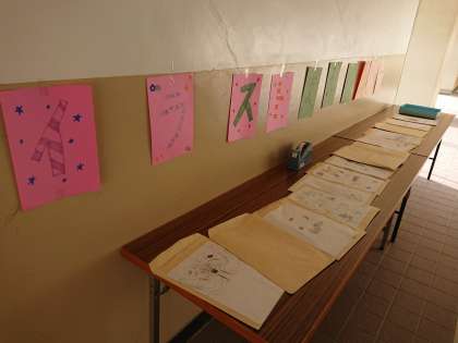 玄関ピロティではパソコンクラブの動画が流れています。「佃小学校のお気に入りの場所」というテーマで一人ひとりが紹介しています。また、職員室前ろうかには、イラスト・まんが、手芸・料理、ものづくりの各クラブの作品が展示されています。子どもたちの創意工夫された作品、創造性豊かな作品が展示されています。